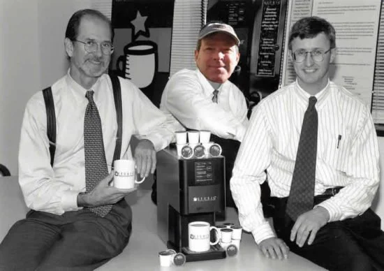 Left to Right: Sweeney, Sylvan (photoshopped on), and Dragone with early models of the Keurig brewer and K-Cup pods. Source: Buy/Don’t Buy